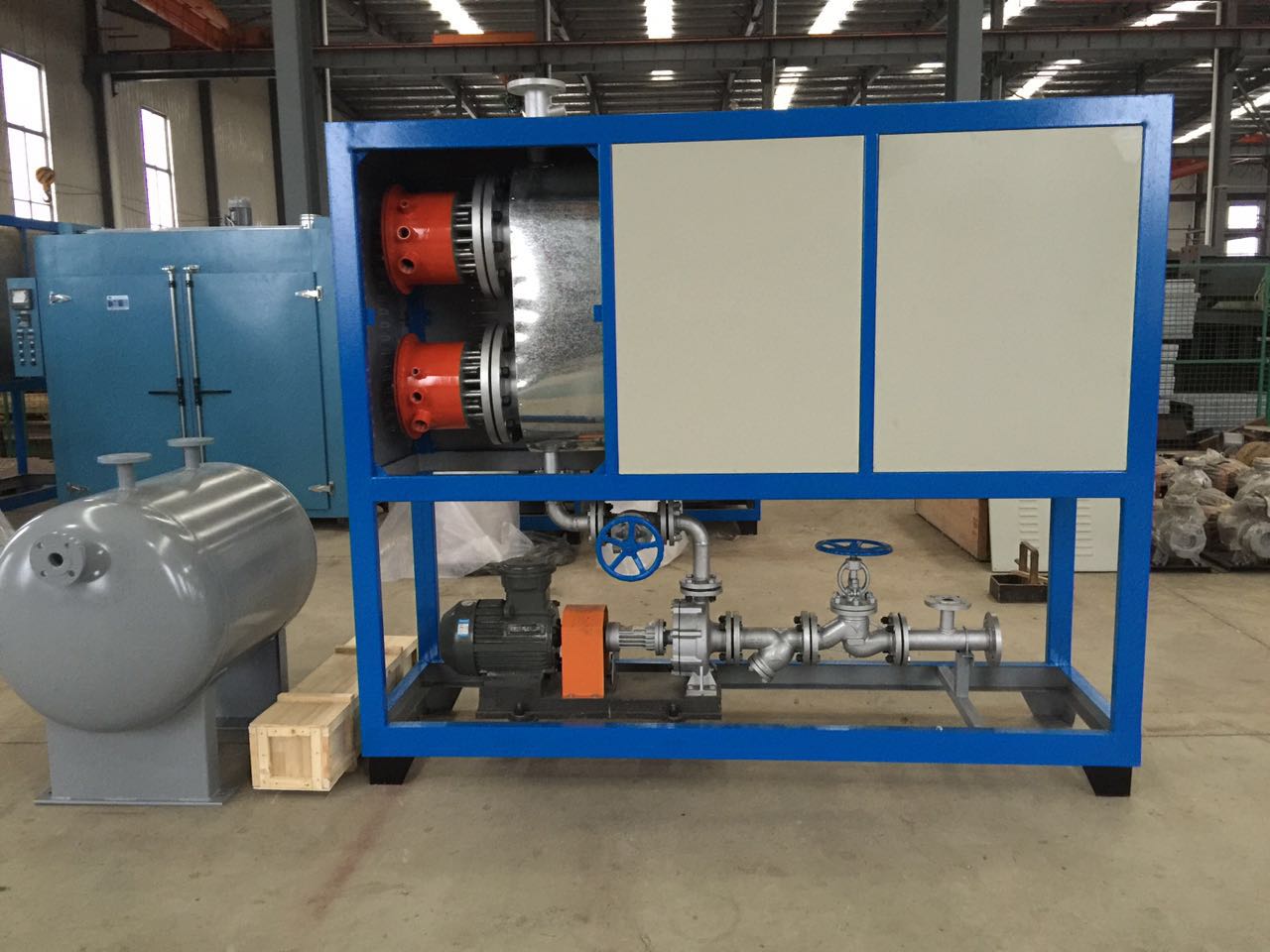 導(dǎo)熱油爐排氣流程: 1、導(dǎo)熱油通過膨脹槽注油口處加注,并通過膨脹口管道流入設(shè)備及油爐本體內(nèi),此時注油時一定要打開系統(tǒng)中所有的閥門(放油閥除外),讓導(dǎo)熱油流入筒體及需加熱設(shè)備內(nèi)。 2、當(dāng)液面顯示約為膨脹槽高度1/2時,停止注油。 3、首 行常溫排氣:接通電源,打開導(dǎo)熱油加熱器的進出口閥門及排氣閥(膨脹管道閥門需一直開著以及時補充油量),按動油泵啟動按鈕,油泵運行,油泵應(yīng)按箭頭指示方向正常運行,壓力表壓力顯示在規(guī)定范圍內(nèi),視聽油泵運行情況,如有異常現(xiàn)象應(yīng)立即停機檢查,將故障排除后再重新起動油泵,進行常溫下排氣,直至壓力表指示穩(wěn)定。進行常溫排氣時,要注意觀察膨脹槽內(nèi)的液位,當(dāng)?shù)陀谝?guī)定的液位高度時要及時進行補充。 4、升溫脫水:在確認常溫下運行正常后,即可進行升溫脫水排氣(操作前詳閱導(dǎo)熱油使用說明書及溫控儀使用說明書),升溫脫水排氣可按如下步驟進行: 步:升溫至100-120℃保溫 開始升溫時,應(yīng)該控制升溫速度在50℃/h以內(nèi),并且監(jiān)視壓力表顯示是否正常,如發(fā)現(xiàn)無壓力或壓力不穩(wěn),說明系統(tǒng)內(nèi)仍有殘留氣體,此時要求按3要求重復(fù)進行常溫排氣操作,待系統(tǒng)壓力穩(wěn)定后方可繼續(xù),升溫至120℃后進行長時間保溫,保溫時間的長短與系統(tǒng)總?cè)萘考皩?dǎo)熱油的質(zhì)量有關(guān)。  第二步:升溫至150-180℃保溫。  排除油中輕組分、揮發(fā)物及殘余水分,請參照KRD系列導(dǎo)熱油加熱器系統(tǒng)脫水排氣曲線圖操作 第三步:脫水排氣完成后要關(guān)閉排氣閥(其它閥門無需關(guān)閉),投入正常升溫運行。 5、 升溫脫水排氣過程有關(guān)事項。 升溫過程中管路可能會發(fā)出碰擊的響聲,說明系統(tǒng)內(nèi)有大量氣體或管道不暢,此時要降低升溫速度,待氣體排除便可消除聲響;如系管道不暢所至應(yīng)予以排除。 脫水排氣過程可能會有大量氣體涌入膨脹槽,造成槽內(nèi)導(dǎo)熱油外溢,操作前要在溢油管下安置好溢油容器。 進行脫水排氣時,現(xiàn)場必須有人員看守,發(fā)現(xiàn)異常及時處理。   對于所提的油泵無油或少許油流出的問題,解決方案如下: 1、 關(guān)閉出油口閥門,啟動油泵,觀察壓力表顯示情況,若無壓力,則說明回油口無油補充油泵,使得油泵空轉(zhuǎn),無后續(xù)油及時補充,則請貴司檢查一下回油口的供油情況,此時請確保膨脹槽里有油并膨脹管道閥門打開和需熱設(shè)備有油并出油口閥門在打開狀態(tài)。 2、 如果以上要求都執(zhí)行到位,壓力表還無壓力,請檢查油爐上的油泵、截止閥及過濾器是否堵塞。 3、 若壓力表顯示壓力值,而油泵、截止閥及過濾器并無堵塞,那油爐的出油口一定會按油泵所提供的流量進行流出。